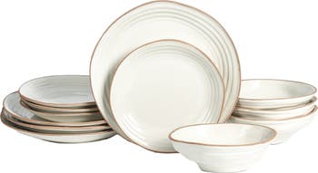 Casual and chic, the Stone Lain Nami Stoneware Dinnerware Set comes glazed in a soft . Meticulously crafted from high-quality stoneware materials, each piece boasts an artisanal ceramic shape, complemented by free-form rims and ripple details that mimic the raw movement and texture of oceanside sand. While this set offers a beautiful cohesive look, you'll find slight variations from one dish to the next, making it a unique, beach-inspired addition to your modern tablescape. THIS SET INCLUDES: 10.9" dinner plates 8.3" salad plates 7.5" cereal bowls