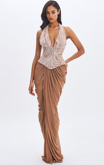 Nancie Beaded Halter Peplum Ruched Maxi Dress