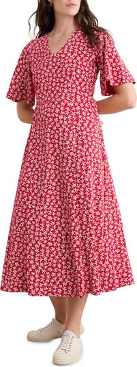 Fluttery sleeves and a flared skirt give movement and ease to this soft, stretchy jersey dress covered in ditsy blooms for sweet style points everywhere you go.