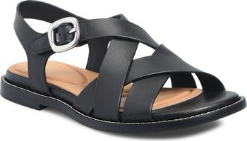 Crisscrossing leather straps add dimension to a casual slingback sandal grounded by a well-cushioned footbed and grippy sole for comfort and stability.