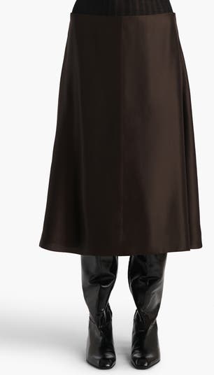 The label's meticulous elegance pervades a satin midi skirt that's softened with a hint of silk.