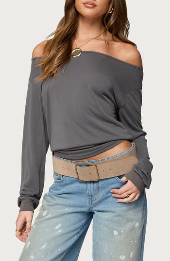 Supersoft and comfortably stretchy, this relaxed-fit top with roomy long sleeves is designed to casually slip off the shoulder.