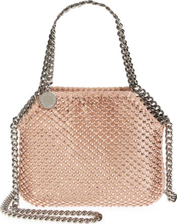 Light-catching crystal mesh enlivens this satin bag that features signature diamond-cut chains forming the top carry handles and crossbody strap.