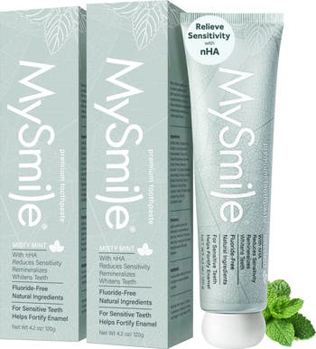 MySmile Nano-Hydroxyapatite Toothpaste 2-Pack (0.42oz each) strengthens enamel, eases sensitivity, mint fresh, fluoride-free, and packaged in low-waste tubes.
