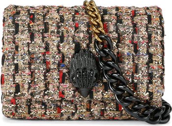 A boucle knit with metallic thread highlights the structured profile on a compact bag suspended from a polished chain strap.