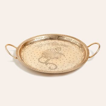 The Nanpur patterned round handled metal decorative tray reflects the eclectic spirit of the Heritage collection in its most sophisticated form. Crafted by artisans in India, this elegant tray combines golden tones with both modern and authentic appeal. From tea hours to evening gatherings, it elevates every occasion with style while serving as a striking decorative piece on a side table.