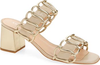 Polished leather straps showcase contrasting textures on this block-heel slide sandal set on a cushioned insole.
