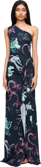 One shoulder dress with a beautiful ruffle detail through the front. Featuring a thigh high split and floor length silhouette. Artwork in collaboration with Anouk Colantoni.