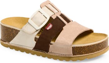This colorblocked three-strap sandal is designed with a contoured footbed that alleviates stress and increases circulation as you walk.