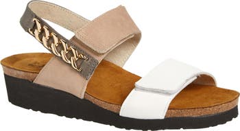 Gleaming chain-link hardware details the slingback strap of a rich leather sandal set on a well-cushioned footbed with arch support.