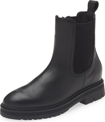 A rear pull-tab and side zipper offer easy entry on a luxe leather bootie lifted by a subtle platform and low block heel.