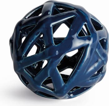 This contemporary little orb is made of thin ceramic strips, which are hand formed, and sparingly shaped into a rounded form, creating an open feel. The orb is then finished with a reactive deep blue glaze. It is perfect for a wide open bowl or tray.