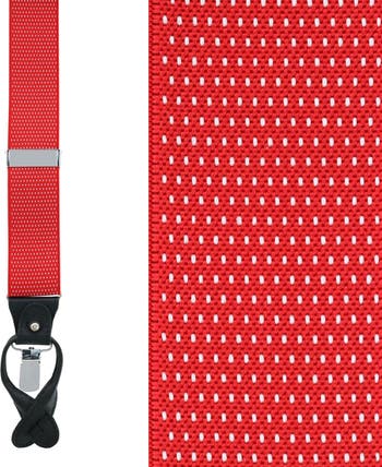 The Napier Convertible End Braces are a classy way to add a pop of color and pattern to your attire. Available in bold red and blue or classic black, this accessory will put the finishing touch on your outfit. Crafted in the United Kingdom, the suspenders feature a genuine leather back patch and button ends with silver adjusters and clips. The Y-back style with an elastic back is designed for all-day comfort. These classy braces are perfect for more casual occasions such as office wear and parties as well as more formal events like weddings and graduations. Look your finest all year long with these Napier braces!