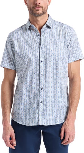 A captivating geometric pattern enlivens a shirt tailored from stretch-enhanced cotton with pops of contrast that show when you unbutton the collar and flip up the sleeves.