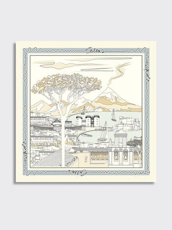 A silk twill scarf is a featured accessory throughout the Câllas collection. The unique print is created to be a ""souvenir"" of the inspiration for the collection. This season, the glossy silk twill features a graphic illustration of the landmarks of Naples. As the Câllas collection continues to be inspired by destinations throughout the world, the Câllas scarves will be available in limited series to collect. FREE SHIPPING AND DUTIES PAID IN THE USA AND EUROPE (EU). ALSO AVAILABLE IN TURQUOISE/YELLOW MADE IN ITALY More Details 100% Silk twill Professional dry cleaning recommended Dimensions 90 cm x 90 cm / 35.4"" x 35.4"