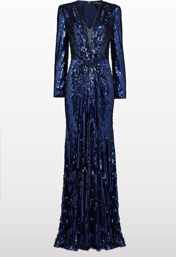 A true statement piece, this gown is designed to captivate from the moment you arrive. Cut in a sleek, elongated silhouette, it features a plunging neckline and strong shoulders that frame the body with sculptural precision. The surface is fully encrusted with light-reflecting sequins, transitioning into high-shine paillettes that cascade through the skirt and pool elegantly at the hem. With its refined drama and bold luminosity, this is an evening look made for the spotlight.