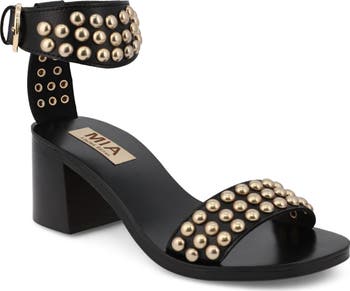 Edgy dome studs saunter over the faux-leather straps on a striking two-piece sandal lifted by a stacked heel and secured with an adjustable buckle closure.