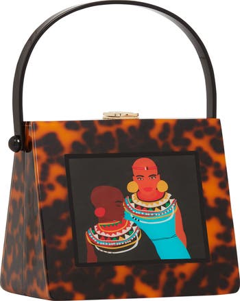Acrylic Tortoise Shell Top Handle Bag w/ contrast handle. Naserian, meaning “bringer of peace,” is inspired by the quiet strength of the Maasai and their historic resistance to slavery and exploitation. W 6.3 × L 7.3 × D 4.5 inches
