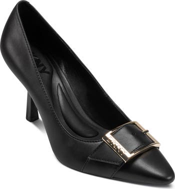 A logo-engraved buckle authenticates this faux-leather pump set on a cushioned footbed for comfortable struts.