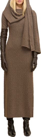 Get two looks on one hanger with a cabled sweater dress knit from a luxe blend of wool and cashmere and topped with a scarf that can be worn around the neck or as a hood.