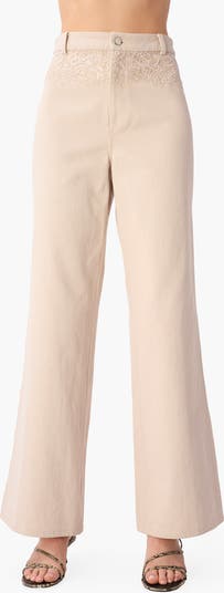 Corded floral lace brings romantic charm to these high-waisted jeans cut from comfortable cotton denim in a wide-leg silhouette.