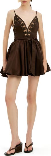 Step out in sophisticated style with this flared satin minidress featuring a tie belt and lacy trim along the deep V-neckline.
