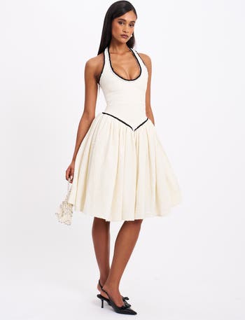 Natalie U Neck Halter Drop Waist Tweed Midi Dress