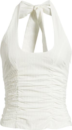 Ruched princess seams give shape to this textured cotton halter top that hugs your curves perfectly.