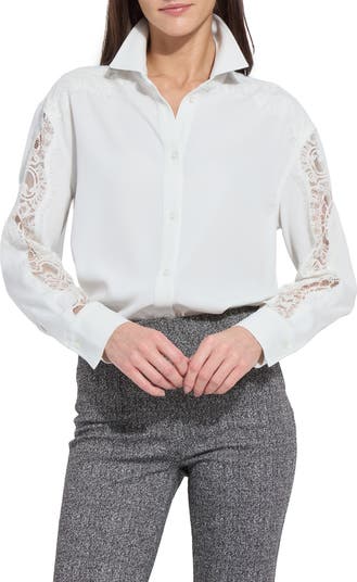 A sheer lace inset brings an air of romance to this stretch-enhanced button-up shirt.