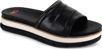 A tiered platform lends sporty elevation to this chic slide sandal featuring a supple leather strap with playful ruching for added texture and dimensionality.