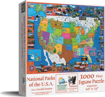 Embark on a captivating journey across the USA from the comfort of your home with the National Parks of the USA 1000 Piece Jigsaw Puzzle from SunsOut Puzzles, crafted with beautifully licensed artwork by renowned artist Gerald Newton. Assembled proudly in the USA, this puzzle is meticulously die-cut with pieces that fit snugly and precisely, ensuring a smooth and frustration-free experience. The vibrant imagery captures the breathtaking beauty of iconic wildlife and landscapes, inviting you to incorporate the essence of America’s natural splendor into your leisure time. Designed to last, SunsOut Puzzles are made from high-quality recycled cardboard and eco-friendly soy-based inks. As a testament to SunsOut’s commitment to sustainability, our puzzles use the finest recycled materials, contributing to a mindful entertainment experience that supports a woman-owned, green business. More so, we stand by our dedication to quality and customer service, offering a worry-free guarantee to promptly address any issues with missing or damaged pieces. Make this puzzle more than a relaxing activity, but a celebration of nature’s majesty, artistic brilliance, and responsible craftsmanship. Delight in piecing together unforgettable landscapes, all while supporting sustainable and eco-friendly choices.