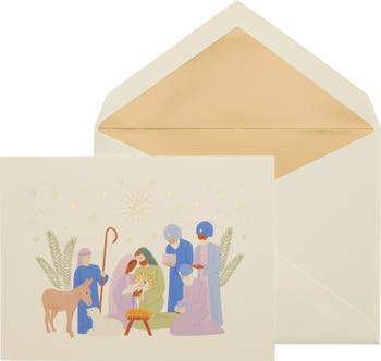 This handcrafted holiday card—that comes in a set of 10—is elevated with a beautifully illustrated nativity scene accented with foil flourishes. They come with coordinating envelopes lined in gold, instantly providing a pop of holiday spirit as soon as the card is opened.