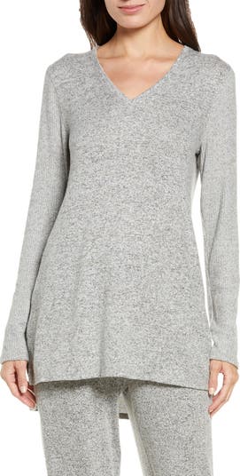 Cozy and lightweight, this lounge sweater goes from bed to brunch without any doubt. Fit: this style fits true to size. - V-neck - Contrast ribbed long sleeves - Heathered knit construction - Side split hems - Approx. 30" length (size S) - Imported