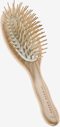 Acca Kappa's pneumatic brushes are ergonomically designed to reduce structural damage to the hair while brushing. The cone-shaped wooden pins easily penetrate the hair, while the rounded tip of each wooden pin gently massages the scalp. Our Beechwood brushes are hand-finished and never varnished. Beechwood is naturally anti-static. Regular: Ideal to prepare medium and long hair for styling. Travel-Size: Ideal to prepare short and medium hair for styling. Dimensions Standard: Overall length 215mm, length of handle 100mm, width 60mm Travel: Overall length 180mm, length of handle 80mm, width 45mm Please note, there may be a small level of tolerance within these dimensions. How to Use Starting from the mid-section, or few inches from the end of your hair, brush down the hair’s length. Moving the brush further up a couple of inches at a time, continue brushing downwards until you reach the scalp and the hair is fully detangled. To finish, gently stimulate the scalp by running the brush over the scalp in the direction of the hair’s fall a few times.