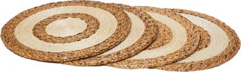 Combined with dark banana leaf fibers and white sisal, this placemat is sold individually and is perfect as a statement centerpiece or buy several for a unique table setting for your indoor and outdoor dining. 14" Diameter Sold individually Made from handwoven banana leaf and sisal The ideal housewarming gift and the perfect material for both outdoor and indoor dining, the Natural Banana Leaf and Sisal Placemat adds a nice touch to any tabletop!