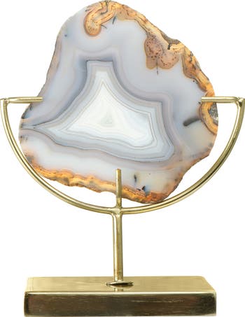 A natural brown agate slice is showcased in a simple, gold stand. Featuring swirling layers of color, display on an accent table, shelf, or nightstand to bring an elevated earthy vibe to your space. The agate is removeable and can be used separately as surface decor to highlight your favorite trinkets and treasures or as a base for filled container candles.