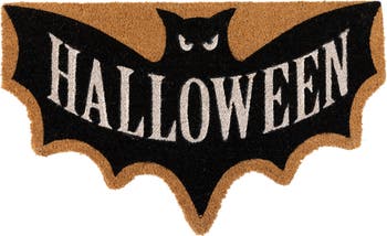 Get ready for the spooky Halloween season with this coir doormat. This bat shaped mat features "Halloween" in white print inside a spooky black bat. This doormat has been made for long-lasting durability and color. Enhance your entry or patio area with a new doormat that fits your Halloween decor! Product Features: Halloween bat door mat Features "Halloween" inside a spooky black bat Non-skid durable backing which helps to keep your doormat securely in place Recommended for both indoor or outdoor use Care instructions: rinse with a hose and air dry Dimensions: 18"H x 30"W x 0.75"D Material(s): rubber bottom/coir fiber