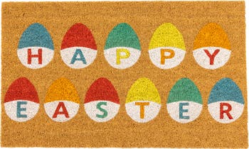 Celebrate the joyous spirit of Easter with this outdoor doormat. This charming doormat is the perfect way to welcome guests to your home during the festive spring season. The vibrant design features a collection of colorful Easter eggs arranged in a cheerful pattern, adding a playful touch to your doorstep. Whether you're hosting an Easter gathering or simply want to spread some holiday cheer, this spring doormat will be the perfect addition. Product Features: Non-skid durable backing which helps to keep your doormat securely in place Recommended for both indoor and outdoor use Care instructions: rinse with a hose and air dry Dimensions: 18"H x 30"W x 0.75"D Material(s): coir/rubber