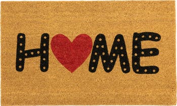 Create an inviting atmosphere with this natural coir outdoor doormat. This charming doormat is the perfect addition to your entryway. The heartwarming design features a prominent heart shape as the o in "Home", symbolizing love and warmth. Whether you're welcoming friends or returning home after a long day, this doormat invites you to step into a place filled with love and comfort. Product Features: Rectangular outdoor coir doormat Features "HOME" in black print with a red heart as the "O" Non-skid durable backing which helps to keep your doormat securely in place Recommended for both indoor and outdoor use Care instructions: rinse with a hose and air dry Dimensions: 18"H x 30"W x 0.75"D Material(s): coir/rubber