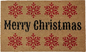 Add this festive Christmas doormat to your home this season. This doormat has been made for long-lasting durability and color. Thick and durable coir fibers are perfect for trapping in dirt and moisture. This mat features red snowflakes with "Merry Christmas" in black print. Enhance your entry or patio area with a new doormat that is sure to fit your Christmas decor. Product Features: Rectangular Christmas doormat This mat features Merry Christmas and snowflakes Non-skid durable backing which helps to keep your doormat securely in place Recommended for outdoor use Care instructions: sweep or lightly hose clean, air dry Dimensions: 18"H x 30"W x 0.75"D Material(s): coir/rubber