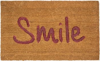 Give your guests some motivation to have their best day with this "Smile" outdoor mat. Thick and durable coir fibers are perfect for wiping feet and for high-traffic areas. Made from durable coir brush mat fibers, it will withstand your family and friends' foot traffic. Product Features: Rectangular natural coir door mat Reads "Smile" in decorative red print Skid-resistant backing Heavy duty construction for lasting durability Perfect for the front door, porch, or garage area Recommended for indoor and outdoor use Care instructions: vacuum, sweep or lightly hose clean Dimensions: 0.75"H x 30"W x 18"D Material(s): coir/PVC
