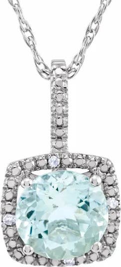 Sterling silver pendant with natural aquamarine and diamonds, showcasing soft blue sparkle in an elegant, classic design.