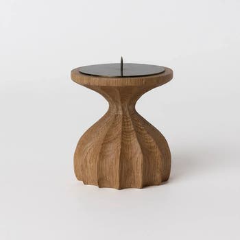 The petite fluted oak wood pillar candle holder is wrapped in a natural finish and adorned with a thin antique brass metal plate. Small in stature, big in warmth.