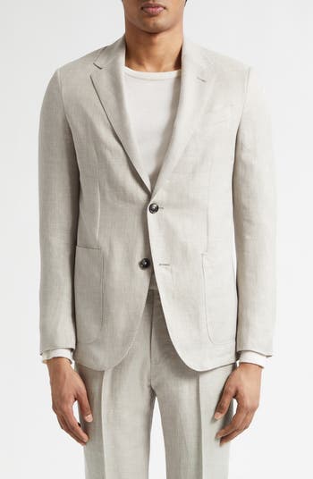 Work-to-weekend polish is yours thanks to this unstructured sport coat tailored from a silk-softened blend of wool and linen with a twilly texture.