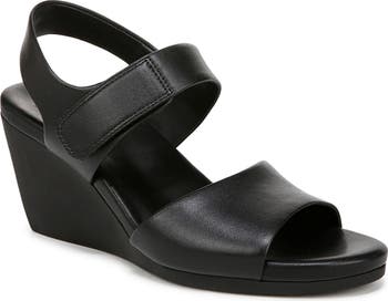 An adjustable instep strap offers a customized fit on a leather slingback sandal lifted by a subtle platform and chunky wedge heel. Reimagined Contour+ Comfort technology offers pressure distribution, less fatigue and longer wear.
