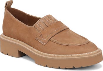 Hidden goring enhances the instep comfort on a streamlined leather loafer featuring premium underfoot cushioning and a treaded sole.
