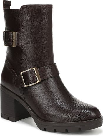 Twin buckles lend a dash of utilitarian shine to the side of a chunky leather boot grounded by a stacked heel and lugged sole.