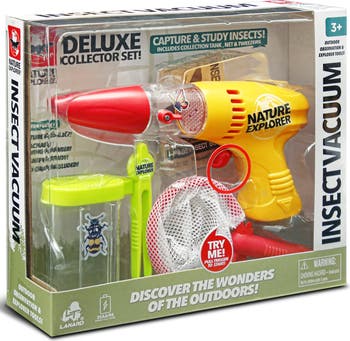 NATURE EXPLORER: INSECT VACUUM DELUXE SET - Grab your gear and BUG OUT! The Nature Explorer Insect Vacuum Set is a great and safe way to learn about all types of curious critters in your neighborhood. The set is mainly aimed toward kids of ages 3 and up. The critter vacuum comes with a detachable microscope chamber. It also comes with a net, tweezers, and a holding cell; the set provides everything you need to go bug collecting! Play right out of the box. The Vacuum requires 3 pcs “AA” batteries (included). For children aged 3 and up. Look for other innovative Nature Explorer toys from Lanard.