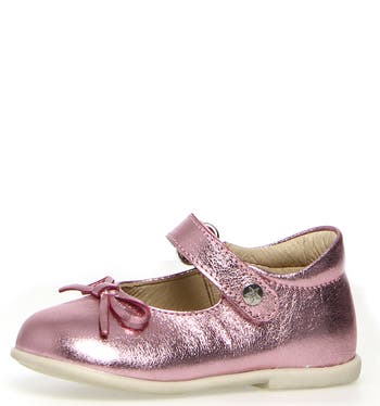Tiny steppers will stay comfortable all day long in this metallic leather mary jane adorned with a dainty bow and a hook-and-loop closure for a secure fit.