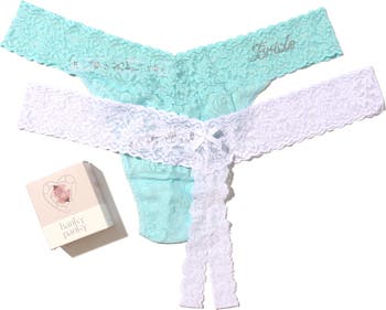 Surprise the bride with a gift box featuring two assorted stretchy lace thongs accented with crystals spelling out 'I Do' on one hip.